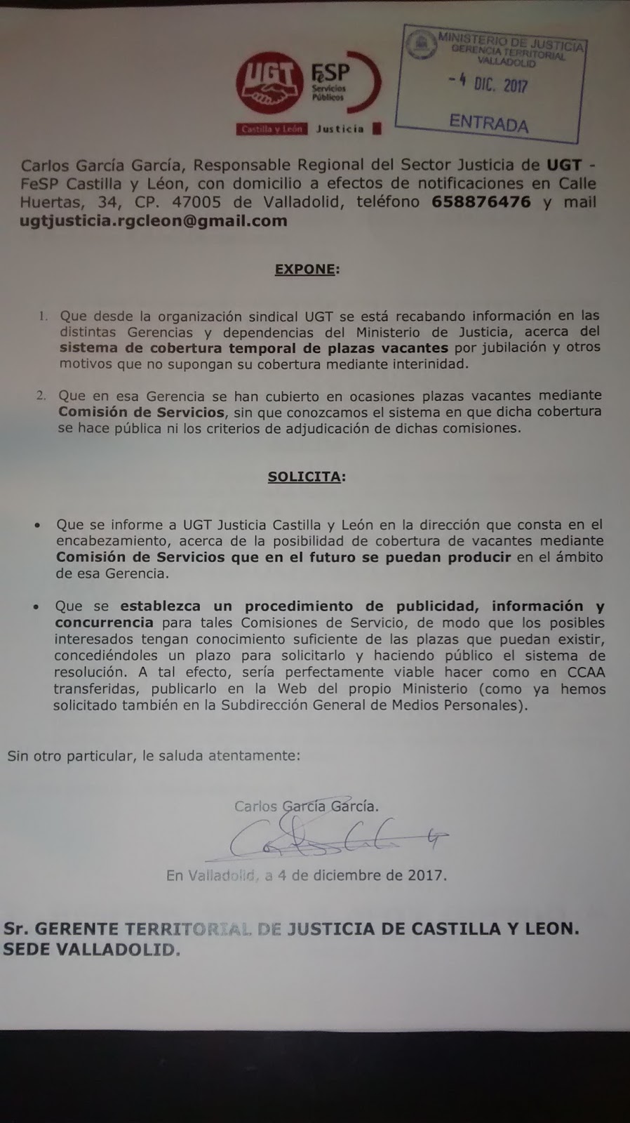 Además, hemos solicitado igualmente al Ministerio, así como a las Gerencias Territoriales de Justicia de Burgos y de Valladolid que en el futuro se establezca un sistema de pública concurrencia en la concesión de cualquier posible Comisión de Servicios que pueda existir.